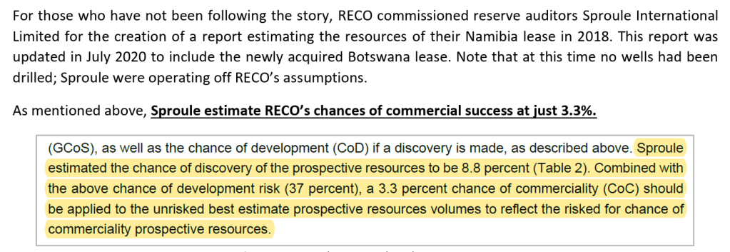 Recon Africa hired Sproule, an energy consulting and advisory firm, to write a report in 2018, which was updated in 2020. The report said there was a very low chance of commercial success (less than 4%), and that any extractable reserves would be unconventional i,e fracking. Sproule based the possibility of recoverable assets strictly on fracking: “the undiscovered petroleum initially-in-place and prospective resources included in the 2020 Sproule Report represent the unconventional (tight gas, shale gas and tight oil) resources on the Company’s lands and do not include potential conventional prospective resources. The company did not commission any other report and relied on the Sproule report as the basis for their investor presentations. https://reconafrica.com/wp-content/uploads/Sproule-Report-ReconAfrica-July-2020.pdf